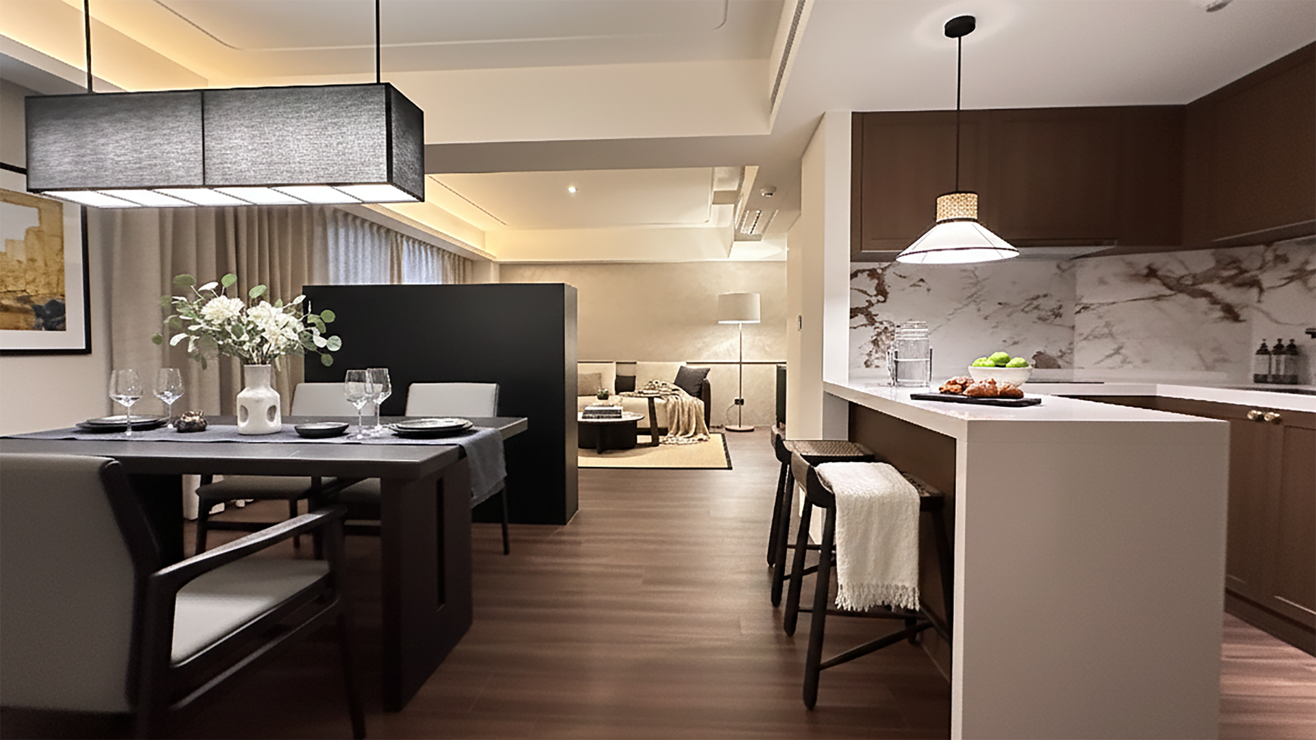 配置具備大理石中島、嵌入式專業咖啡機與完整烹飪設備的廚房,強調「不是暫住,是一段生活」的品牌主軸